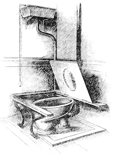 Well into the 1870s, toilet facilities in factories and other workplaces were overwhelmingly designed for one occupant, and were often located outside of buildings. These emptied into unsanitary cesspools and privy vaults generally located beneath or adjacent to the factory. The possibility of indoor, multi-occupant restrooms didn’t even arise until sanitation technology had developed to a stage where waste could be flushed into public sewer systems.