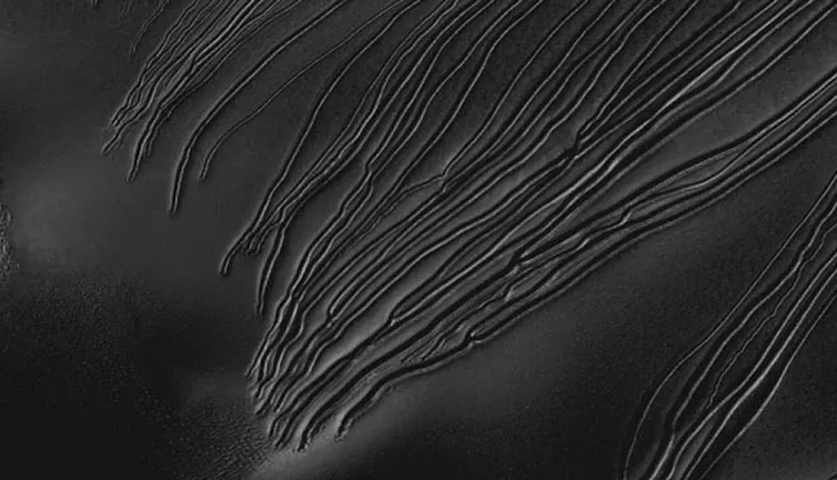 You won’t find solid dry ice occurring naturally here on Earth. However satellite images from NASA’s Mars Reconnaissance Orbiter show the situation is very different on the surface of Mars where large gullies can be found, about 2 km in length. These structures are very different from Earth’s water gullies.