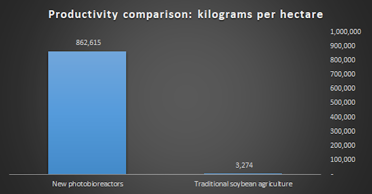 Using this technique, photo-bioreactors can provide similar nutritional content to soybeans at less than 0.6% of the land and water use. A production unit uses 130m² to grow 10,500kg of biomass per year – a 200-fold improvement in resource efficiency.