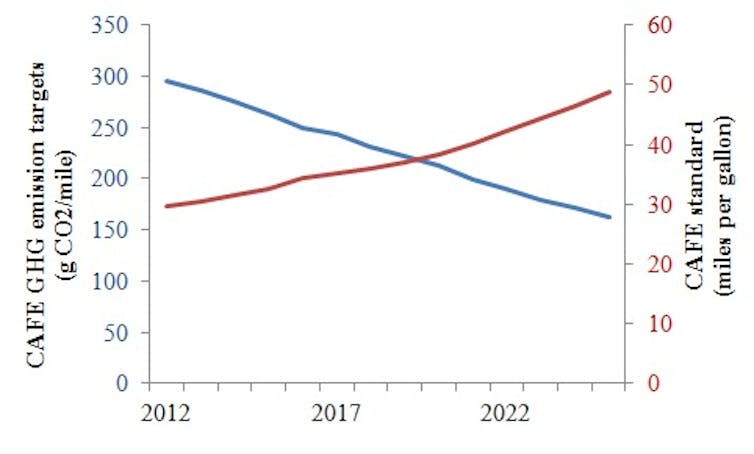 The CAFE standards have become more ambitious under the Obama administration, pushing the average mileage for cars and light trucks from 30 miles per gallon in 2012 to 49 miles per gallon in 2025.