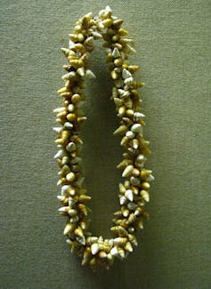 The Bishop Museum in Honolulu holds a shell necklace, or lei, of Queen Lili‘uokalani, the last monarch of the Kingdom of Hawaii. It is made from tree snail shells, which signifies the high rank of female royalty. Wearing a shell was believed to provide “mana,” or spiritual power and a way to understand ancestral knowledge.