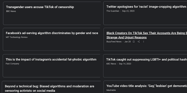 Sur TikTok, une étude menée par le think tank australien ASPI (Australian Strategic Policy Institute) a montré que selon la langue utilisée par l’utilisateur des réseaux sociaux numériques, certains hashtags LGBT+ étaient déréférencés de la plate-forme. Citons-en quelques exemples : يسنج لوحتملا# soit « transgenre » en arabe, #ягей pour « je suis gay » en russe, #Intersex pour « intersexe » en anglais ou encore #gej pour « gay » en bosnien et estonien. Ces quelques exemples constituent une des facettes de ce à quoi peut ressembler la discrimination algorithmique dans la modération des réseaux sociaux numériques.