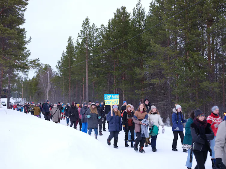 Today, pictures from Russia reveal anonymous anti-war graffiti on the sides of buildings, “no war” chiselled into a frozen river, and yellow and blue chrysanthemums and tulips left at the feet of Soviet war memorials.