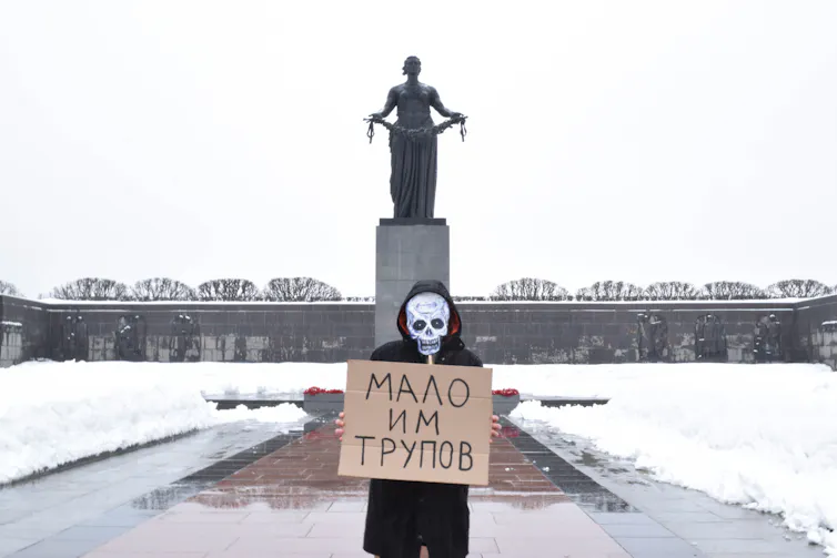 Pictures from the snow-decked Piskaryovskoye Cemetery in Saint Petersburg reveal members dressed as skeletons, holding placards reading: “are there not enough corpses?”.