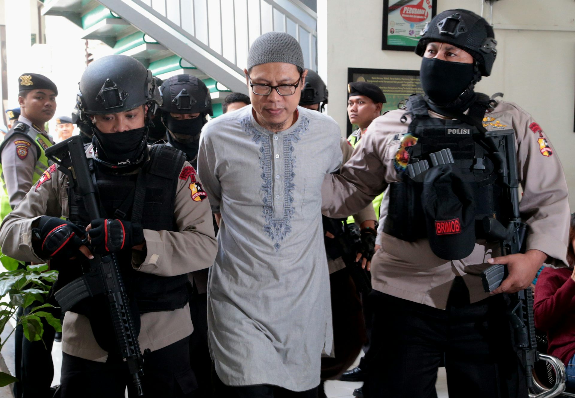Police escort the Indonesian leader of Jamaah Ansharut Daulah (JAD), Zainal Ansori (centre), during his recent trial in Jakarta.