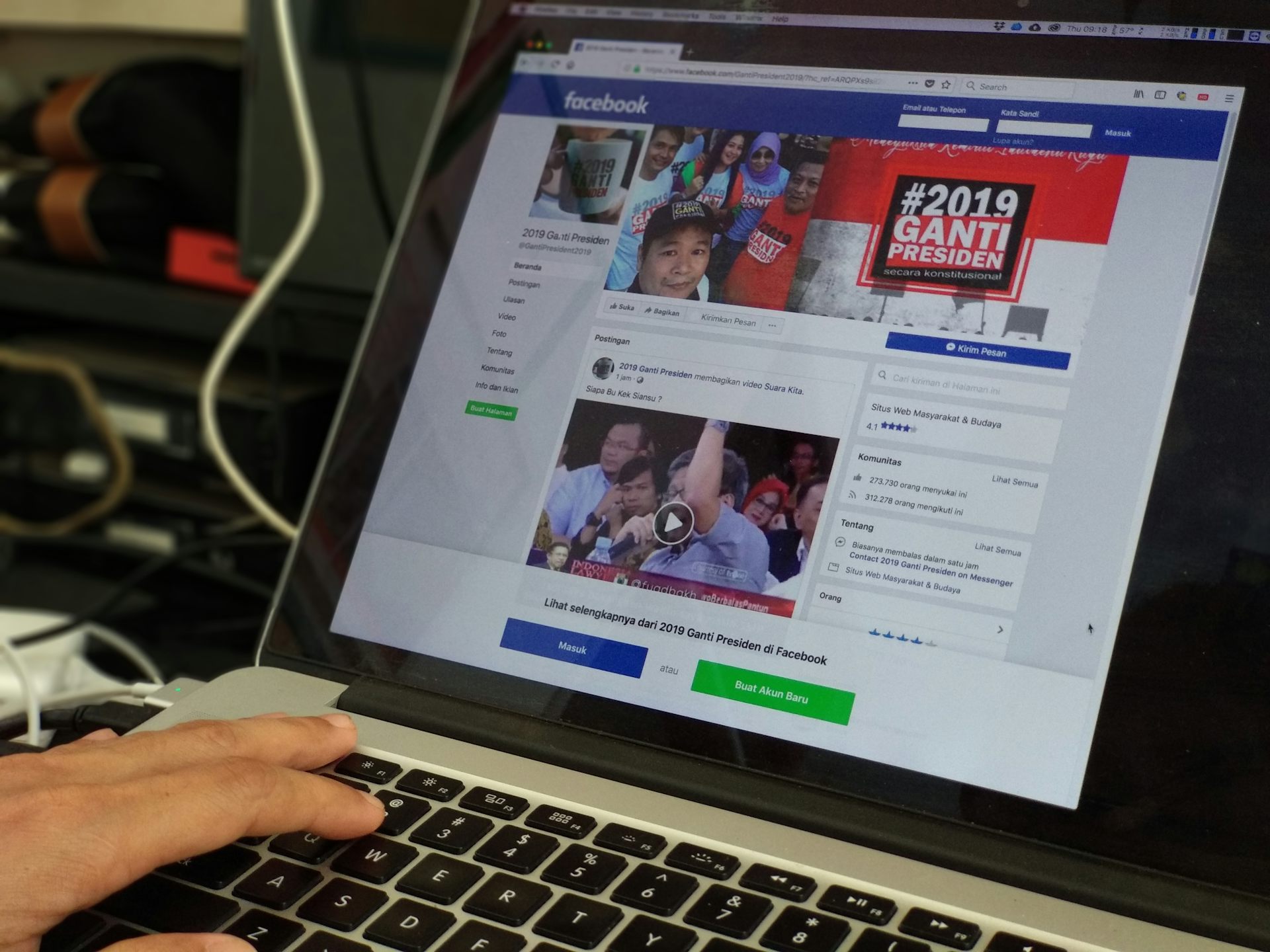 A person browses a Facebook page of #2019GantiPresiden (#2019ChangePresident), a social media campaign opposing Indonesian President Joko “Jokowi” Widodo’s bid for re-election next year.