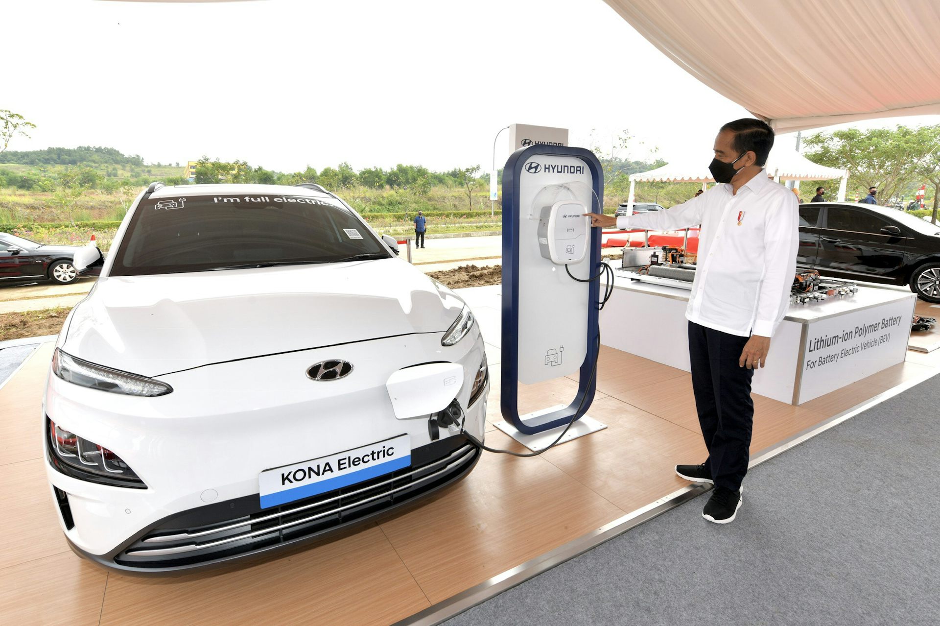 Presiden Joko Widodo meninjau sebuah kendaraan listrik dan alat pengisi daya baterainya saat meresmikan peletakan batu pertama yang menandai pembangunan pabrik baterai mobil listrik di Karawang, Jawa Barat September lalu.
