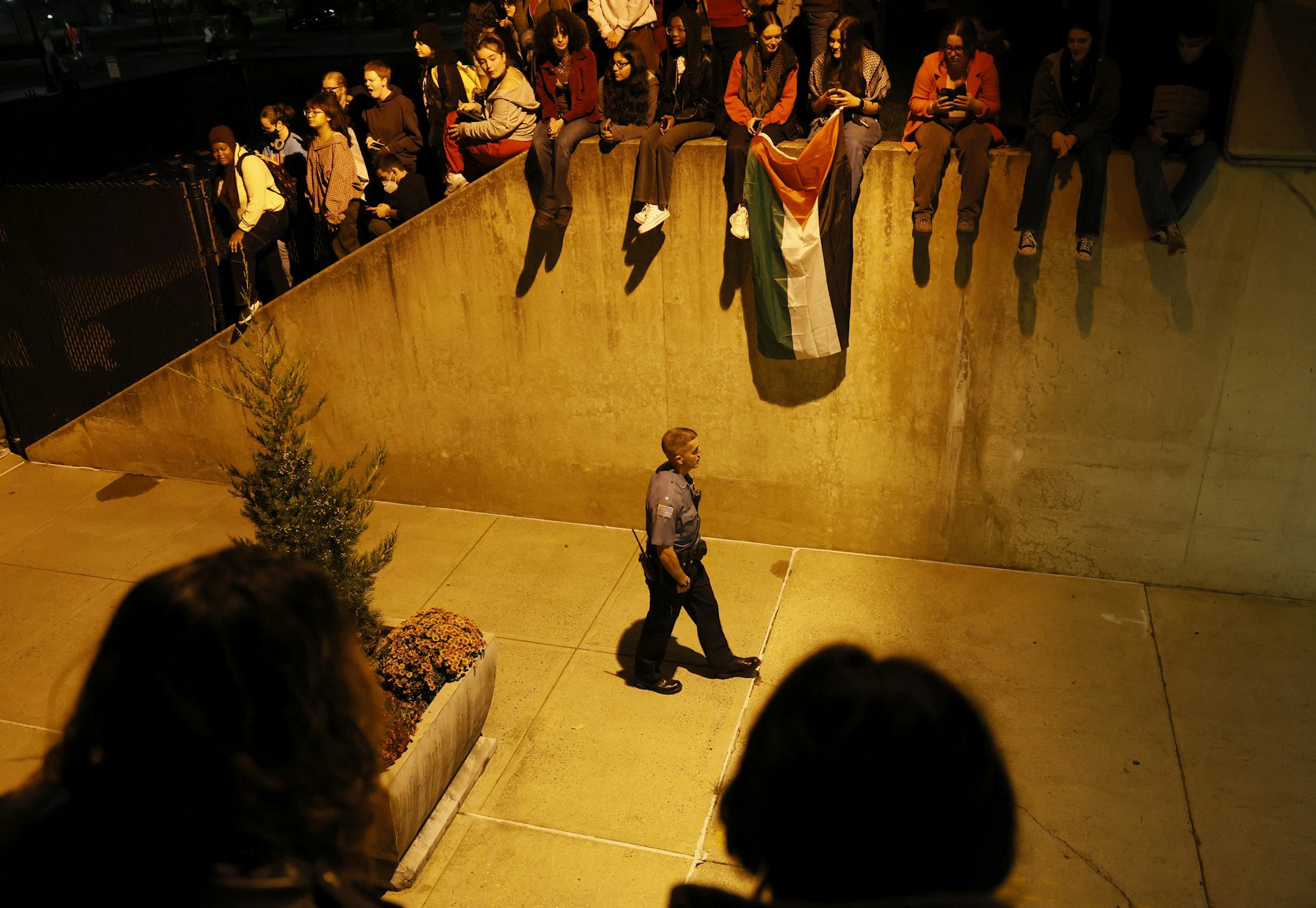 A police officer walks into a building at University of Massachusetts Amherst to arrest students who staged a sit-in outside of the Chancellor’s office.