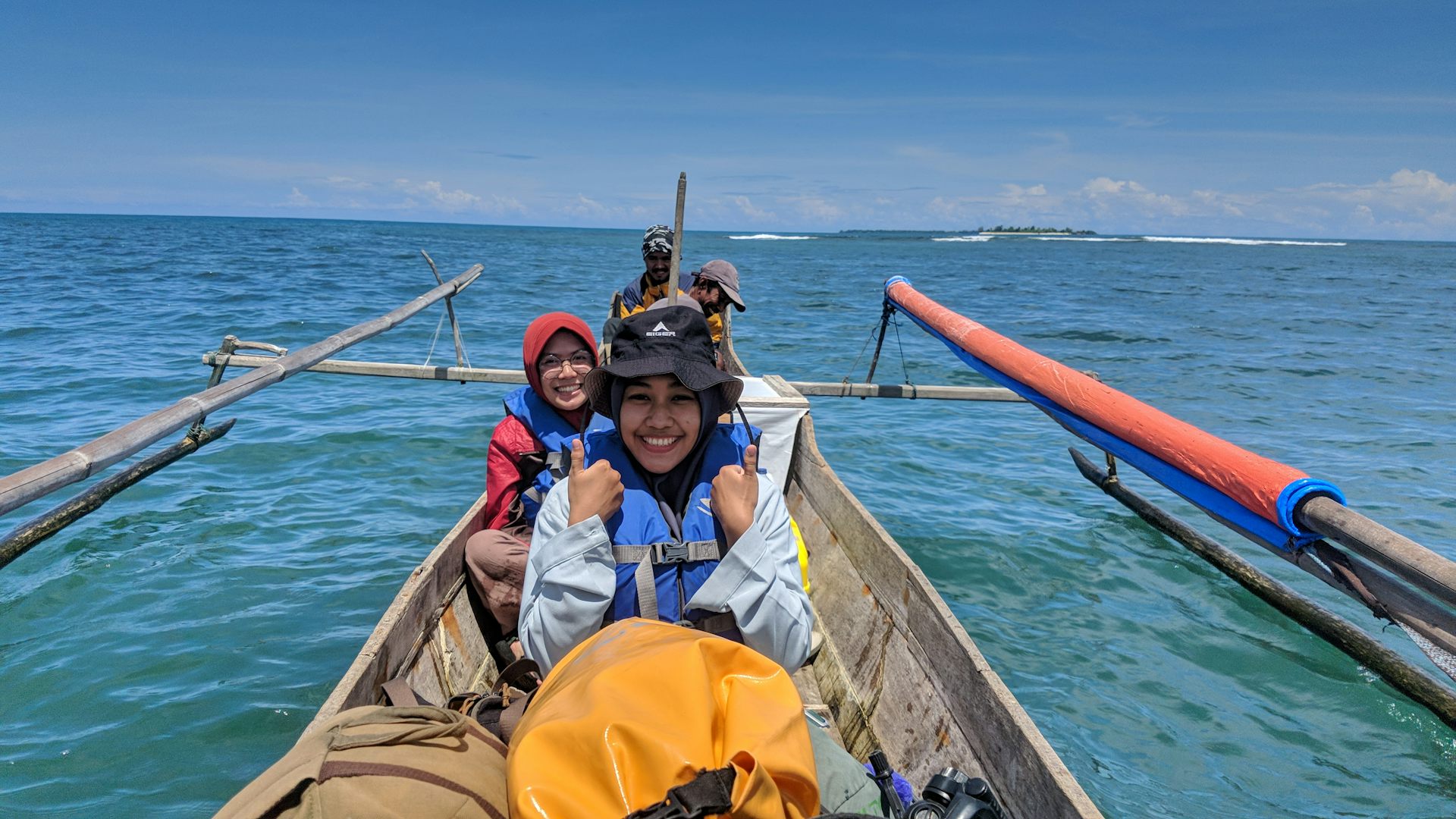 Praktisi konservasi pemula (Lilis dan Elif) naik perahu kembali ke daratan utama setelah kegiatan pemantauan populasi kalong di Bualemo, Sulawesi Tengah.