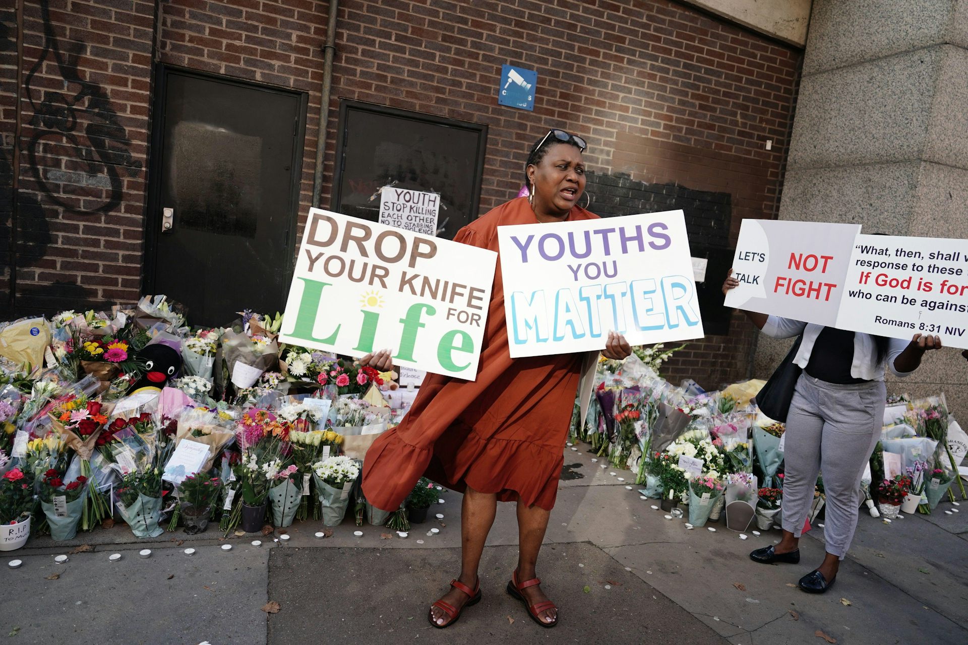 People attend a protest against knife crime at the location in south London where 15-year-old Elianne Andam was stabbed to death in September 2023.