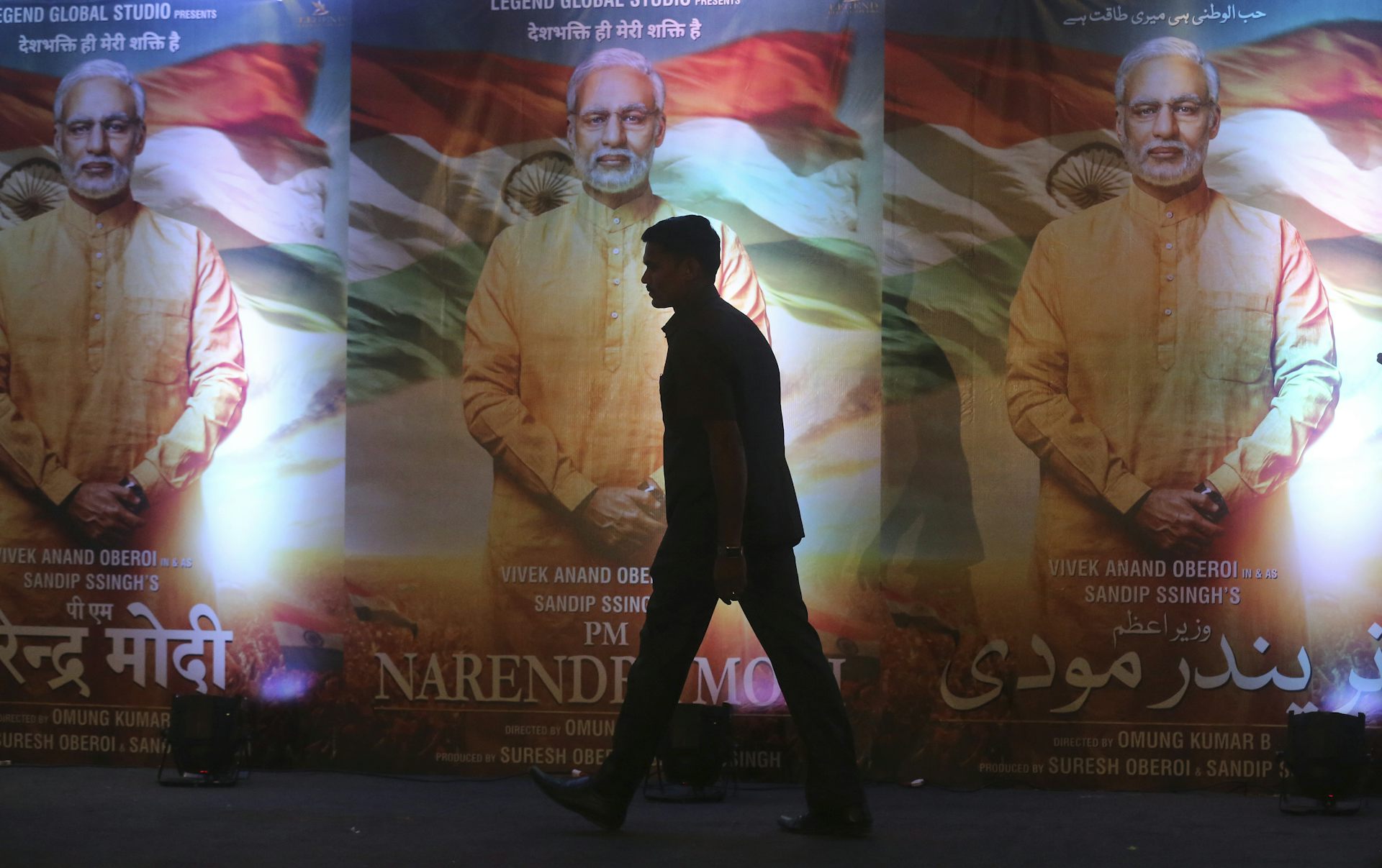 Un homme passe devant les affiches du film « PM Narendra Modi », un biopic sur le Premier ministre indien, lors de son lancement à Mumbai, en Inde, en 2019.