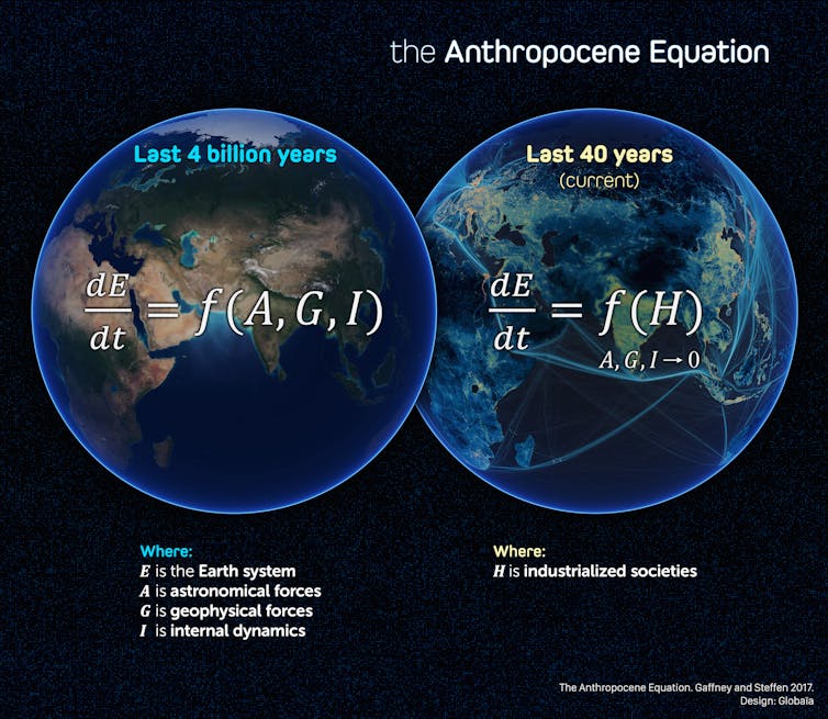 Taking as our starting point a 1999 article by Earth system scientist Hans Joachim Schellnhuber, we can say the rate of change of the Earth system (E) has been driven by three things: astronomical forcings such as those from the sun or asteroids; geophysical forcing, for example changing currents; and internal dynamics, such as the evolution of cyanobacteria. Let’s call them A, G and I.