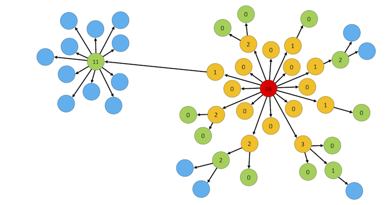 Simply put, a low K value suggests that a small number of infected people are responsible for large amounts of disease transmission. For the 1918 influenza, the number K is thought to be around 1, and perhaps 40% of infected people might not pass on the virus to anybody else. But for diseases like Sars, Mers and COVID-19 with K as low as 0.1, this proportion rises to 70%. In contrast, large outbreaks will be initiated by only few super-spreaders, as shown below.