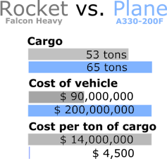 Despite popular conceptions of rocket science, a rocket isn’t really any more complex or expensive than a modern transatlantic jet. Let’s make a comparison between an airplane (A330-200F) and a rocket (Falcon Heavy).