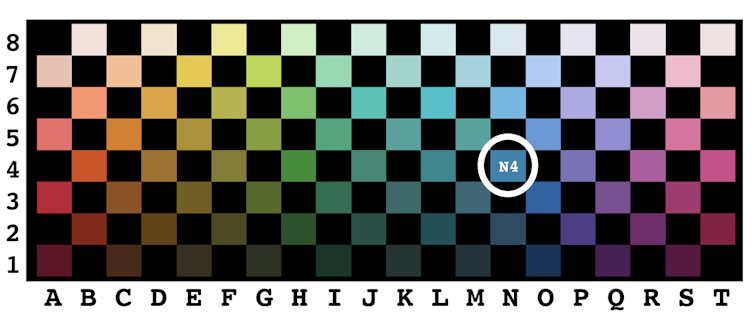 Our research groups therefore explored a completely different idea: Perhaps color words are developed for efficient communication. Consider the task of simply naming a color chip from some set of colors. In our study, we used 80 color chips, selected from Munsell colors to be evenly spaced across the color grid. Each pair of neighboring colors is the same distance apart in terms of how different they appear. The speaker’s task is to simply label the color with a word (“red,” “blue” and so on).