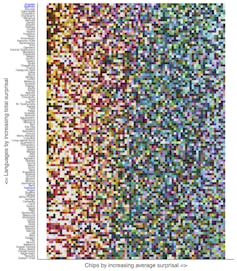 It’s clear in a visual representation, where each row is an ordering of the color chips for a particular language. The left-to-right ordering is from easiest to communicate (fewest guesses needed to get the right color) to hardest to communicate.