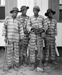 Perhaps due to these perceived cultural changes, in the early 1930s the Library of Congress tasked folklorists John and Alan Lomax with finding and recording older, “authentic” forms of African-American music as an act of preservation, celebration and scholarly inquiry. In 1933, the father-son duo discovered Lead Belly in Angola, a maximum security prison in Louisiana nicknamed “The Alcatraz of the South.” At Angola, convicts sang as they picked cotton, chopped wood and crushed rocks under the blazing Mississippi Delta sun. It was, to borrow a phrase from Pulitzer Prize-winning author Douglas Blackmon, slavery by another name.