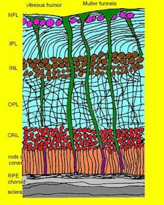 In view of this, my colleague Amichai Labin and I built a model of the retina, and showed that the directional of glial cells helps increase the clarity of human vision. But we also noticed something rather curious: the colours that best passed through the glial cells were green to red, which the eye needs most for daytime vision. The eye usually receives too much blue – and thus has fewer blue-sensitive cones.