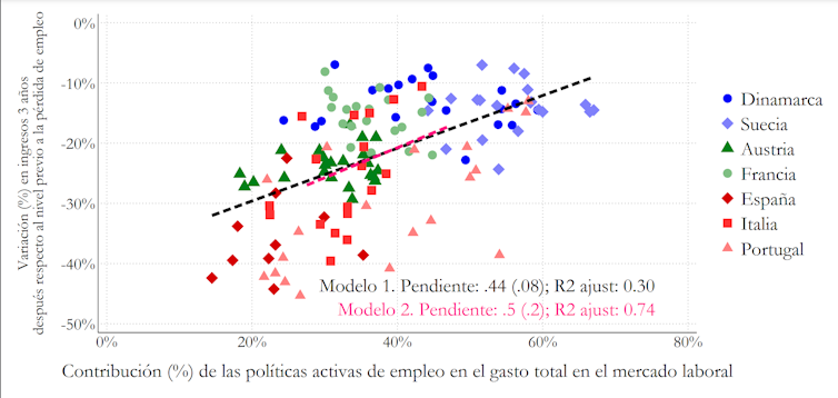 Nuestros resultados sugieren que las políticas activas de empleo, tales como los programas de formación, son un predictor particularmente significativo de las pérdidas de ingresos. En países que implementan más políticas de formación, las caídas de rentas son significativamente inferiores tres años después de perder el empleo.