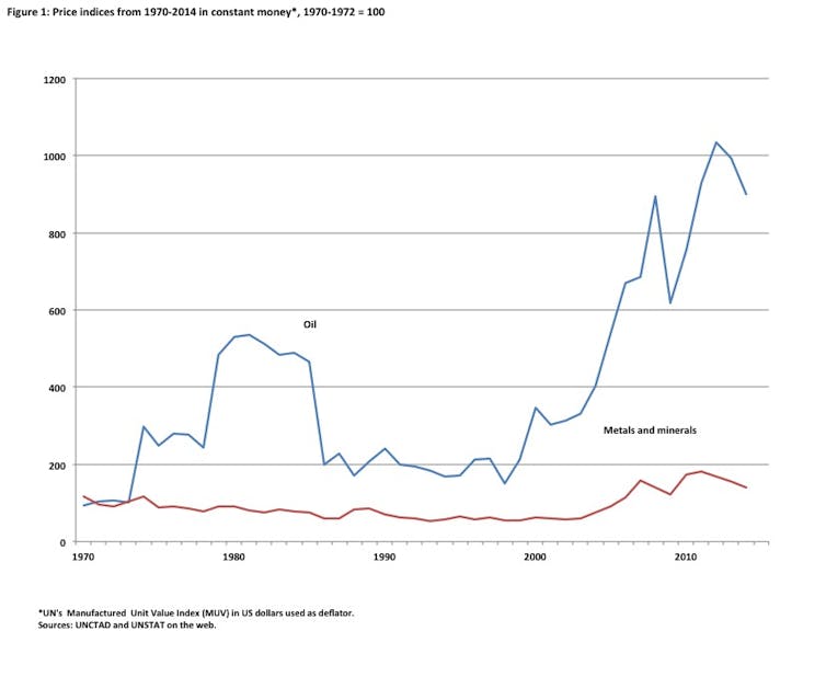 In constant money, prices rose by almost 900% between 1970-72 and 2011-13. This can be compared with a 68% real increase for a metals and minerals price index, comprising a commodity group that, like oil, is exhaustible.