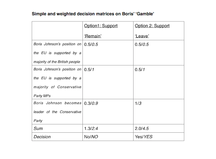 Let’s also assume that Boris would like his position on Europe to be supported by his party and also by the British people. Let us be generous and give both of those objectives a value of 1 as well. This gives us a decision matrix based on the two options: support “Remain” (Option 1) and support “Leave” (Option 2).