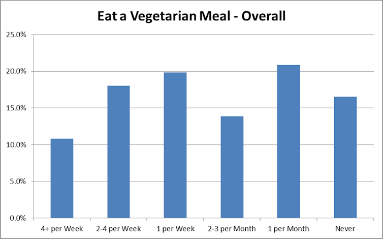 Many surveys also overstate the number of true vegans and vegetarians in Canada. Our recent survey suggests that many of those identifying as vegans or vegetarians are actually eating meat. We found that one third of those who identified as vegetarians and more than half of those who identified as vegans ate meat relatively regularly.