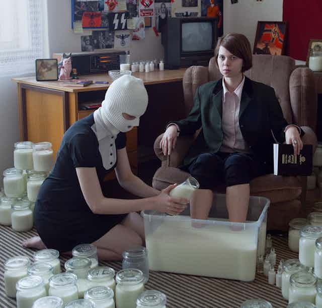 The U.S.-based white supremacist movement that calls itself the “alt-right” has recently embraced milk as a symbol. In February, shirtless neo-Nazi protesters danced outside Shia LaBeouf’s anti-Trump art installation, He Will Not Divide Us, chugging gallons of milk that dripped messily down their chins.