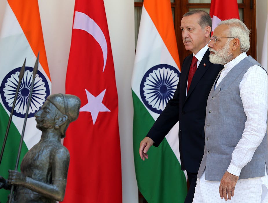 At the beginning of May, Turkey’s president Recep Tayyip Erdoğan’s first post-referendum foreign visit was to meet India’s prime minister Narendra Modi. Despite Erdoğan’s controversial pro-Pakistan statement just before the trip, the pair were pictured sharing friendly hugs as they vowed to tackle terrorism and extend economic relations.