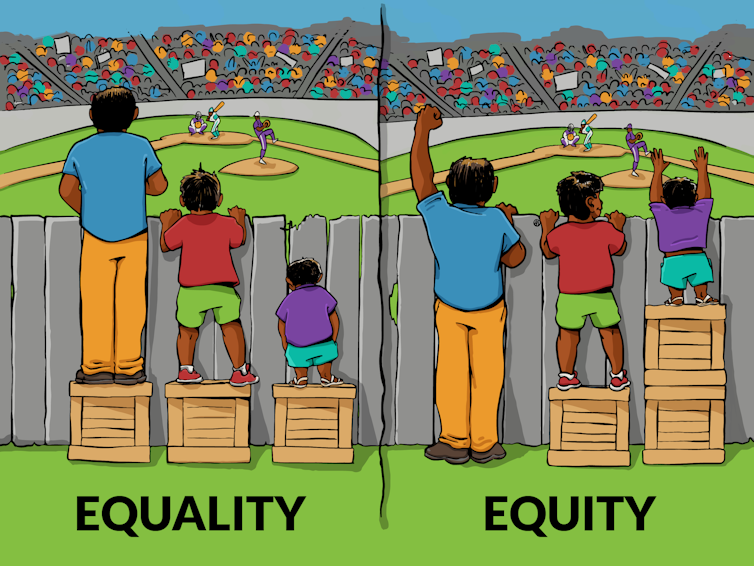 Alternatively, treating everyone differently, according to their needs and humanity is more likely to produce equality of outcomes where everyone can access the game. Equity deals not only with overt discrimination but the systemic factors that give rise to it.