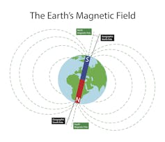 The Earth is surrounded by a magnetic field, generated by the movement of the planet’s liquid core. It’s why a magnetic compass points north. At Earth’s surface, this magnetic field is fairly weak, about 100 times weaker than that of a refrigerator magnet.