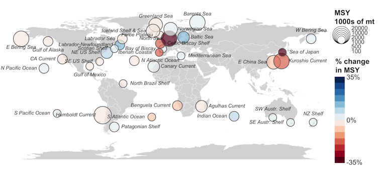 In our study we combined maps of historical ocean temperatures with estimates of historical fish abundance and exploitation. This allowed us to assess how warming has affected those interest rates and returns from the global fisheries bank account.