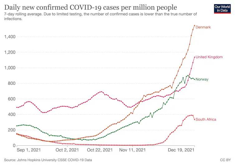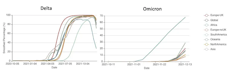 Omicron, the latest variant of concern, was discovered in samples collected on November 8 in South Africa. It rapidly replaced delta as the dominant variant in the country and now accounts for nearly 100% of cases in South Africa.