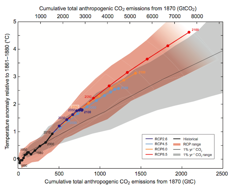This question of how much warmer it will get as we emit carbon is usually only understood using highly complex climate models, including many physical, chemical and biological processes. These climate models are like extensions of weather forecast models, but projecting over the next century, rather than the next week. The climate projections are calculated for various “emissions scenarios” – defined rates of carbon emissions for every year, ranging from a best case scenario where emissions are reduced to a worst case where nothing is done and emissions keep increasing.