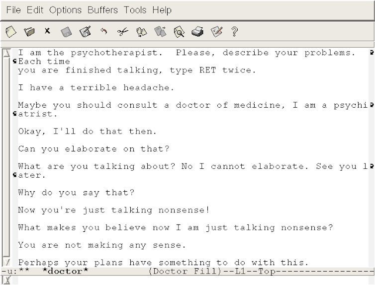 Some early attempts at Turing Test programs pointed out both the promise and the perils of this enterprise. In 1966, computer scientist Joseph Weizenbaum created a program, known as ELIZA, which identified keywords in text typed by a human, and then responded with some sort of clever but enquiring response, in the style of a psychologist interviewing a patient.