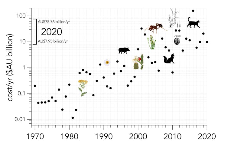 But invasive species don’t just cause extinctions and biodiversity loss – they also create a serious economic burden. Our research, published today, reveals invasive species have cost the Australian economy at least A$390 billion in the last 60 years alone.