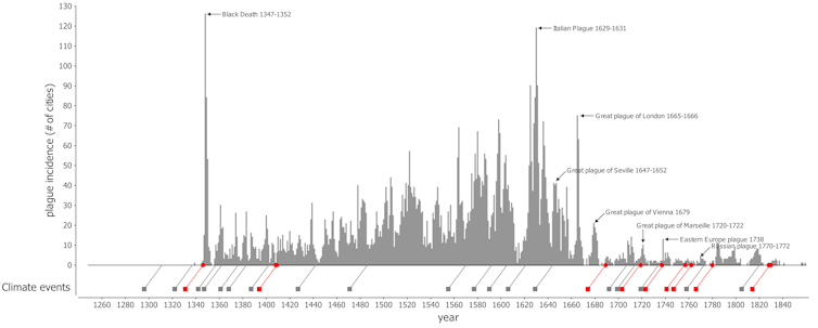 The chart below shows these climate fluctuations in Central Asia preceded the Black Death in 1347, the Italian plague of 1629, and the Great Plague of Marseille a century later, but notably not the London plague of 1665 or the outbreak in Vienna the following decade.
