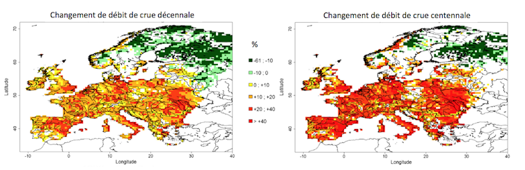 Simulation d’évolution du débit des crues décennales et centennales en Europe entre la période 1970-2000 (référence) et la période de 30 ans quand le réchauffement global atteint 2 °C dans les projections climatiques (résultat médian de 3 modèles hydrologiques forcés par 11 simulations climatiques régionales issues de différents scénarios).