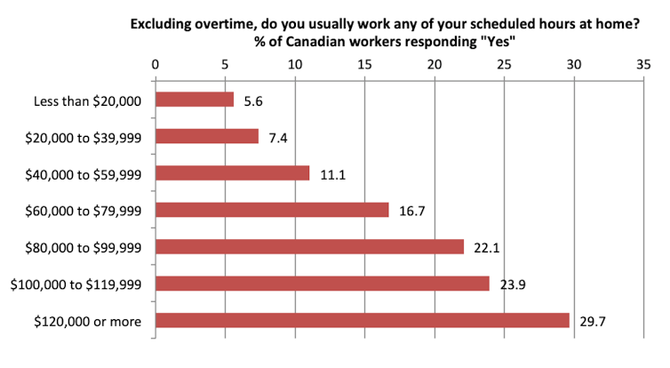 As shown in the graph below, compiled from the 2015 Canadian General Social Survey (GSS), the number of telecommuters increases with personal income. The higher a person’s salary, the most likely they are to be able to work from home: