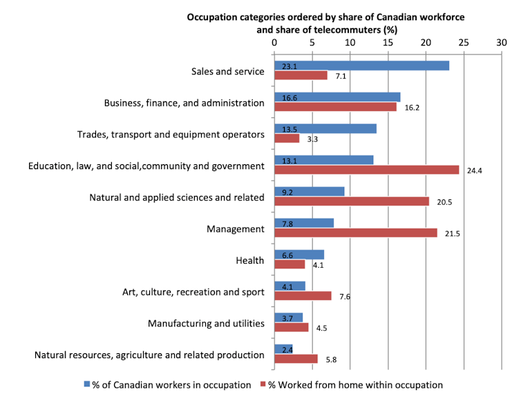 The possibility of working remotely isn’t available to everyone, with one Canadian study estimating that only 44 per cent of jobs are compatible with telecommuting. Remote work is particularly common among university graduates, managers and professionals, but its practice also depends on the sector and the nature of the job. Finance, for example, compared to manufacturing, is more suitable to remote work. Consequently, many workers are deprived of an alternative that allows them to continue working during crises like the COVID-19 pandemic.