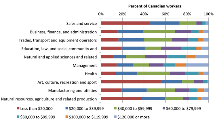 The 2015 GSS data shows that two of the occupation categories employing the most workers in Canada have very low proportions of telecommuters. Remote work is much more frequently practised in only four of the 10 occupation categories. Occupations with a large share of low income workers generally have few telecommuters, as the graphs below illustrate.