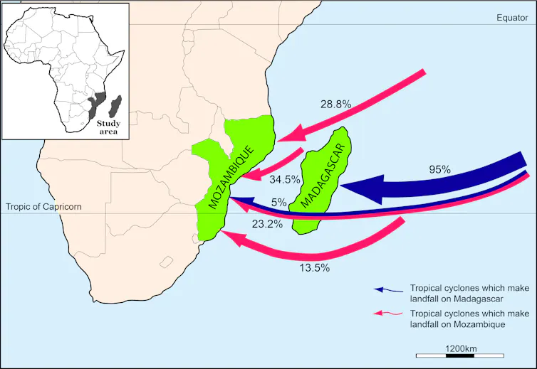 Studies over the past half century in southern Africa show that there’s been a southward shift in tropical cyclones in the region, and in particular the location of their landfall. One study looked at the records of tropical cyclones in South East Africa going back 66 years. Another investigated 19th century tropical cyclone landfalls in Madagascar.