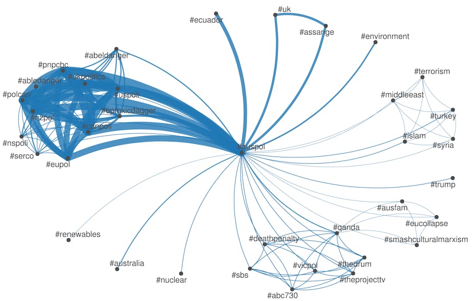 The hashtag network map of #auspol without Russian propaganda references looks considerably different. It reflects domestic political concerns such as the budget or debate over My Health Record, refugee policy and districts that were holding by-elections.