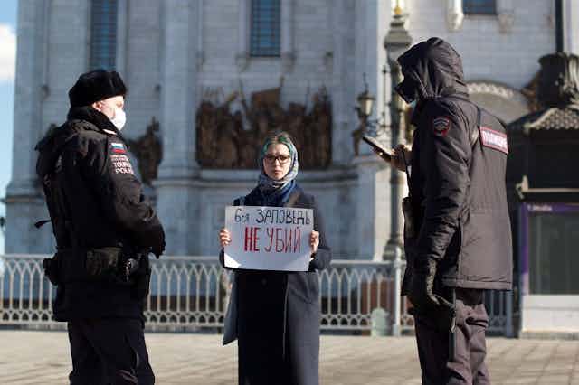 À la mi-mars, par exemple, devant la cathédrale du Christ-Sauveur à Moscou, Anastasia Parshkova a brandi une affiche citant l’un des dix commandements : « Tu ne tueras point ».