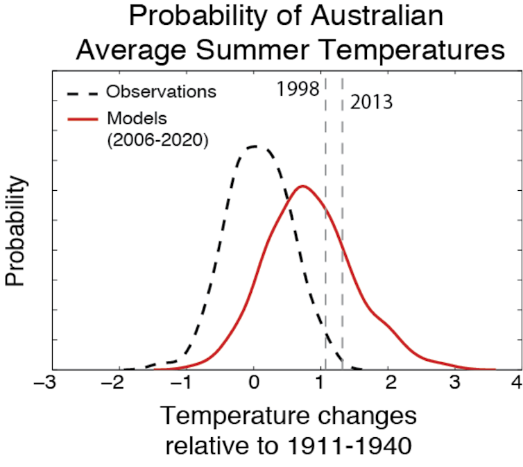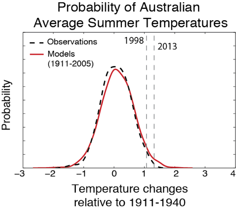 Using these remaining nine state-of-the-art global climate models, we investigated changes in the probability of extreme Australian summer temperatures due to human influences.