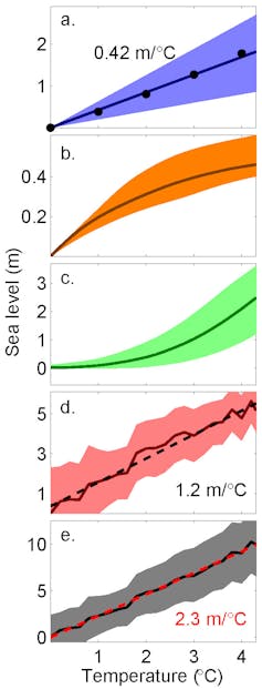 What we found was that for each degree of global warming above pre-industrial levels the ocean warming will contribute about 0.4 metres to global mean sea-level rise while Antarctica will contribute about 1.2 metres. The mountain glaciers have a limited amount of water stored and thus their contribution levels off with higher temperatures. This is over-compensated for by the ice loss from Greenland, so that in total sea level rises quasi-linearly by about 2.3 metres for each degree of global warming (see figure).