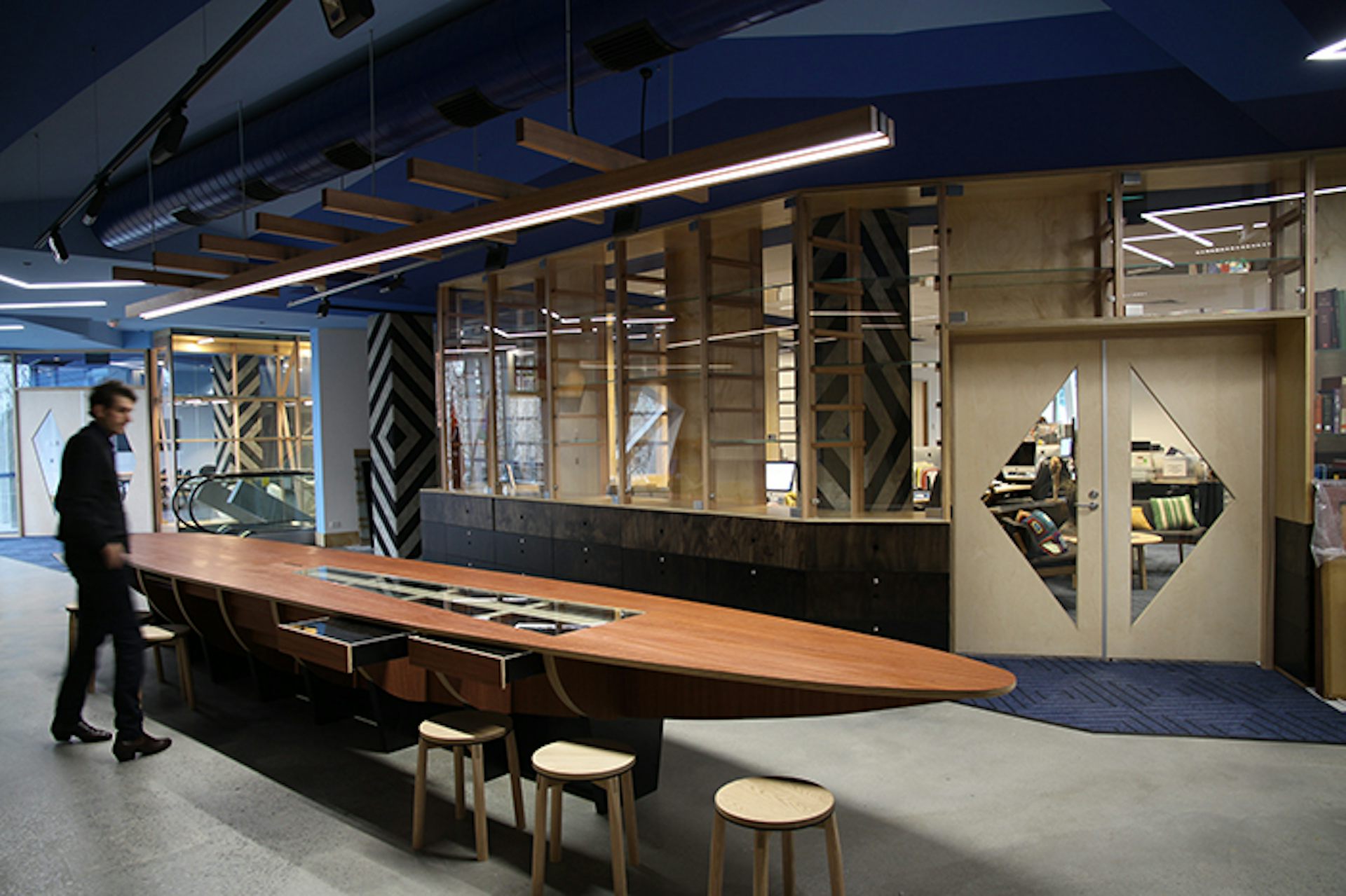 Second, the canoe table is an interactive and inclusive furniture piece. Greenaway describes why the table is his favourite design for the new building: