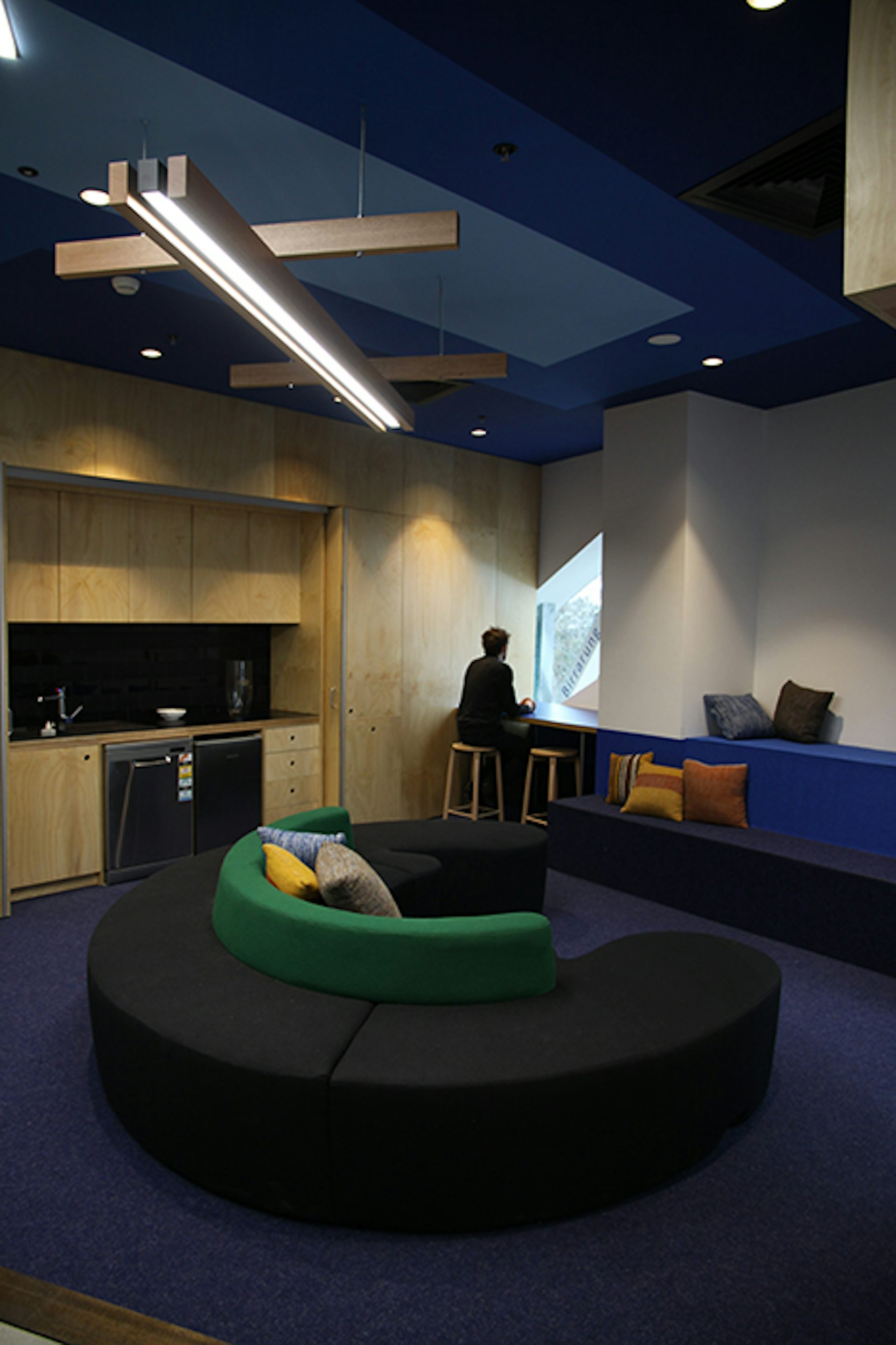 They opened up window apertures that allow one to glimpse the river. Chevrons patterns of light on the ceiling and on textiles on the floor point one towards the river view. The blue colours on the ceilings and the smooth grey pebble concrete floors evoke a feeling of the Birrarung, even when one cannot see it well. An expansive balcony provides unobstructed views of Birrarung.