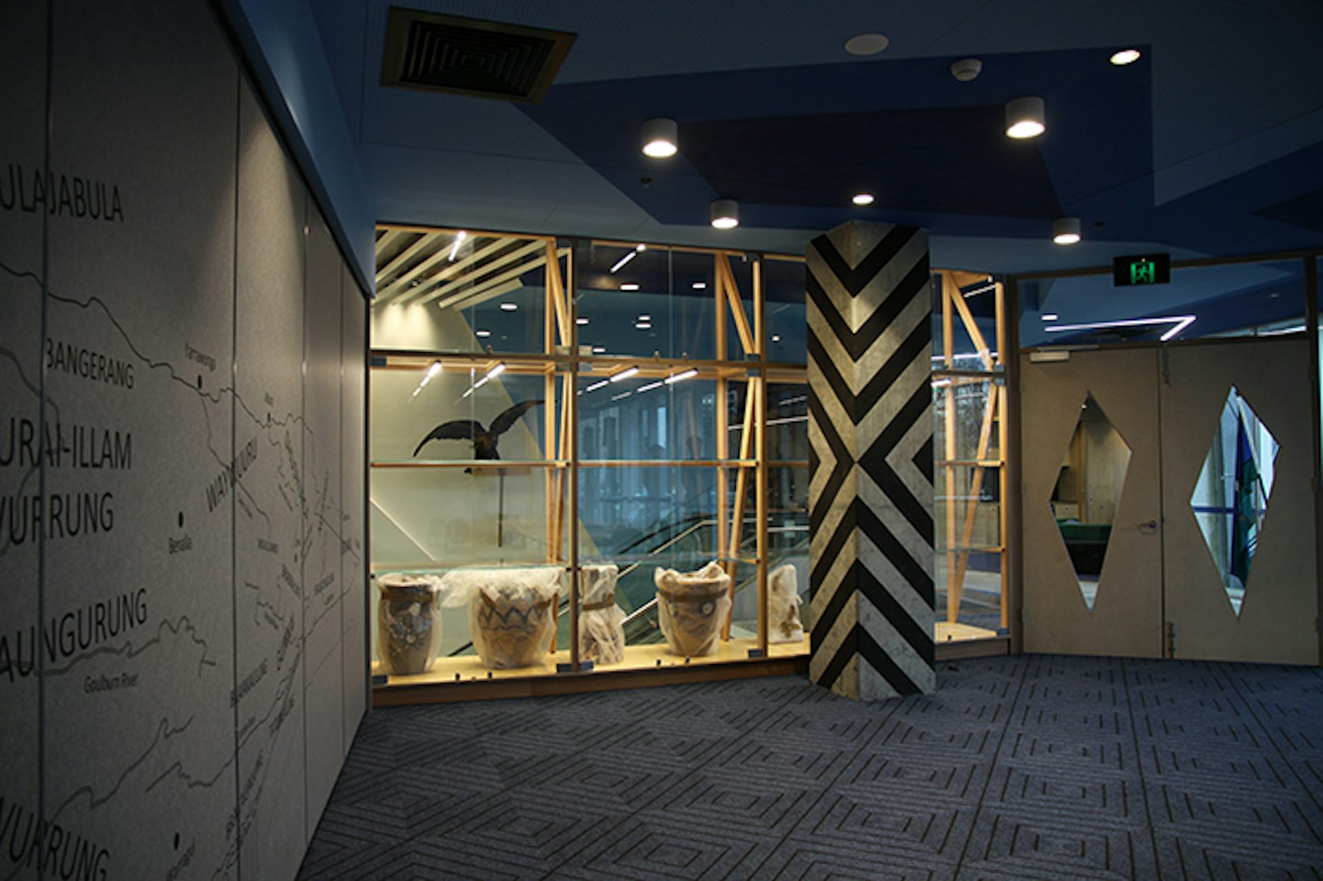 Formal spaces for community engagement and exchange include the large workshop room that accommodates up to 120 school children. A map of local Indigenous languages operates as the room divider that creates two smaller rooms for business meetings, cultural competency workshops, and other corporate functions.