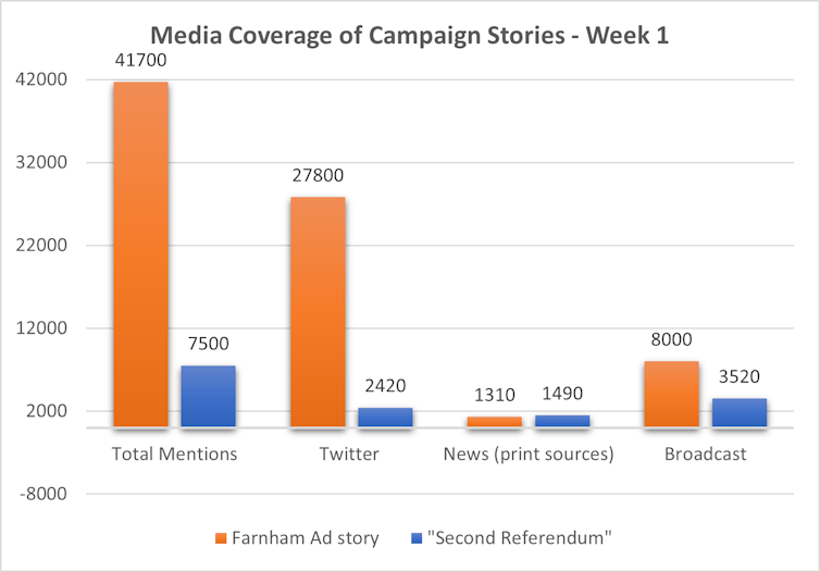 Tracking the impact of the two messages, we find the Farnham ad story far outpaced the “second referendum” in the free media sphere, as shown below.