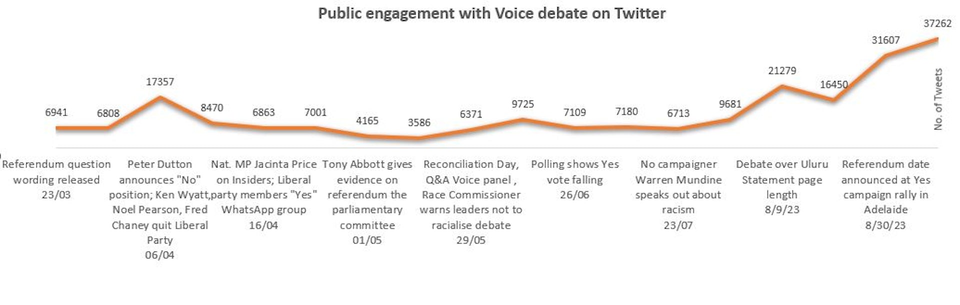 The analysis of X (formerly Twitter) data shows the Farnham ad and “second referendum” stories also created a new high in public engagement about the Voice on the site this year.